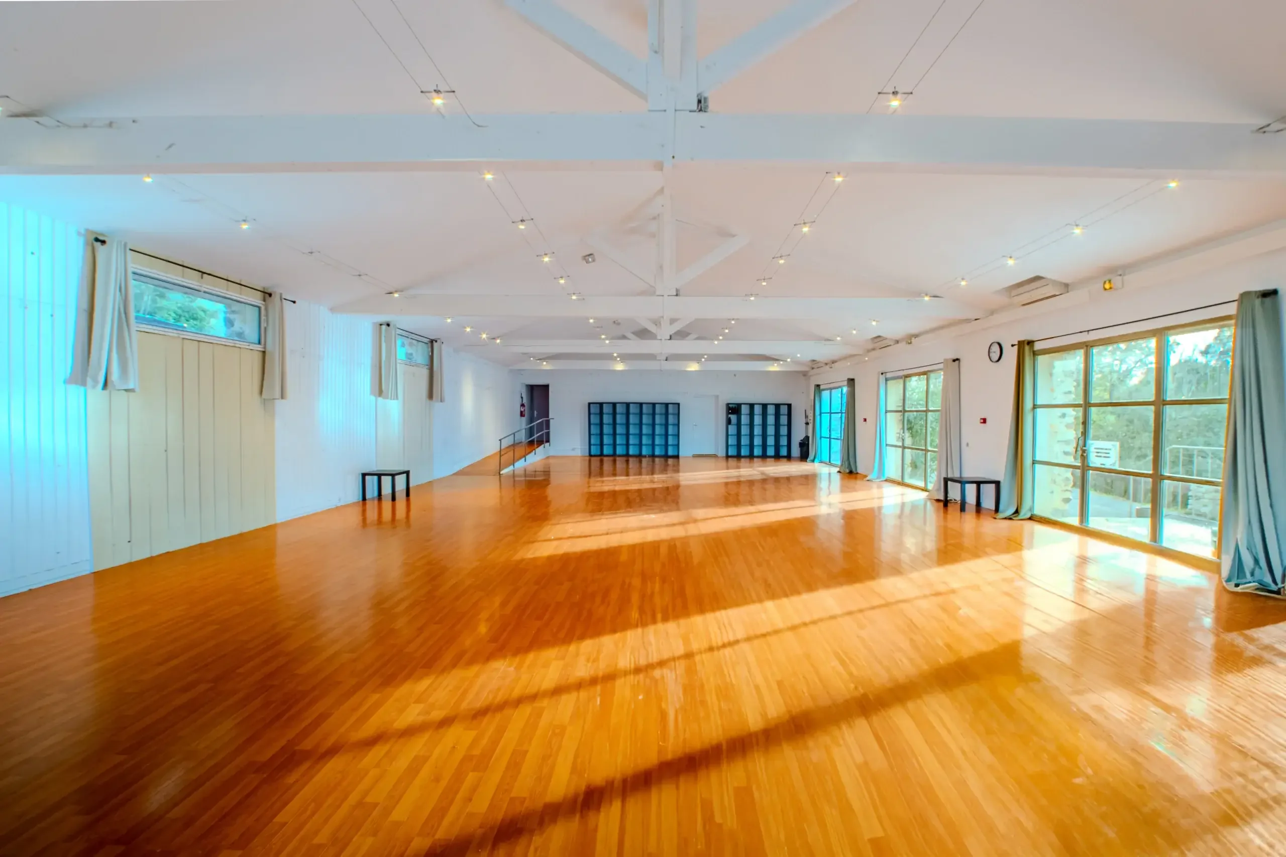 Nous avions deux très grandes salles pour les ateliers Tantra : Grange et Orion. Voici la vue de la terrasse sur laquelle on mange et les deux salles qui étaient à notre disposition pour les structures.