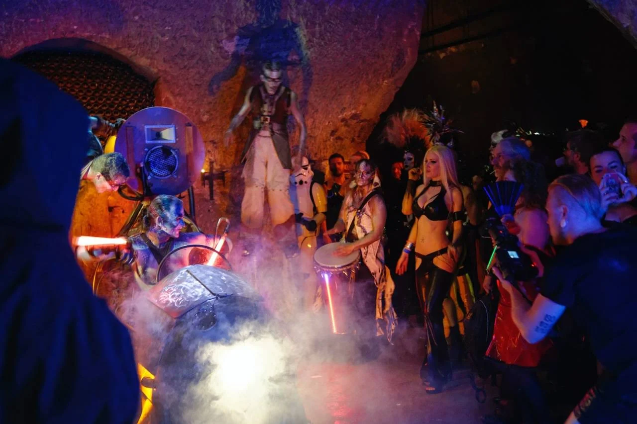 Bientôt nous croisons l’incontournable Fetish Parade, l’ambiance explose, les crayères se transforment en carnaval de Rio croisé avec Mad Max, Starwars et Hellraiser. Un véhicule ouvre la marche, des robots avec des lasers suivent, un personnage entièrement couvert de miroirs et de lasers me fait penser au Gritche du roman de science-fiction incontournable qu’est Hyperion (Dan Simmons).