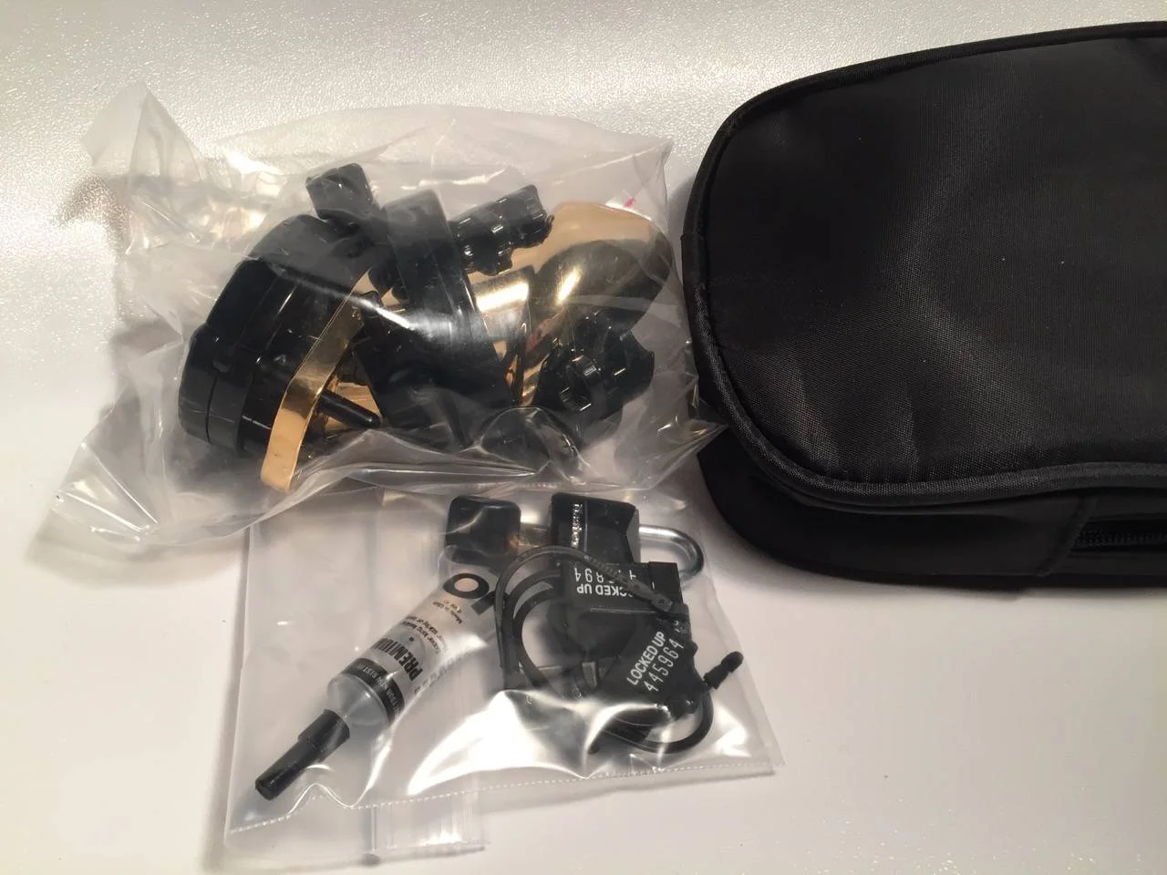 La cage de chasteté CB 6000 Gold est livrée dans une boîte en carton contenant l’image du produit. Rien de bien extraordinaire, et la boîte finira bien vite à la poubelle, sachant en plus qu’une trousse est livrée dans la boîte pour ranger le produit. Le contenu de la boîte est très complet, on y trouve la cage de chasteté accompagnée de tous les accessoires permettant de la régler.
