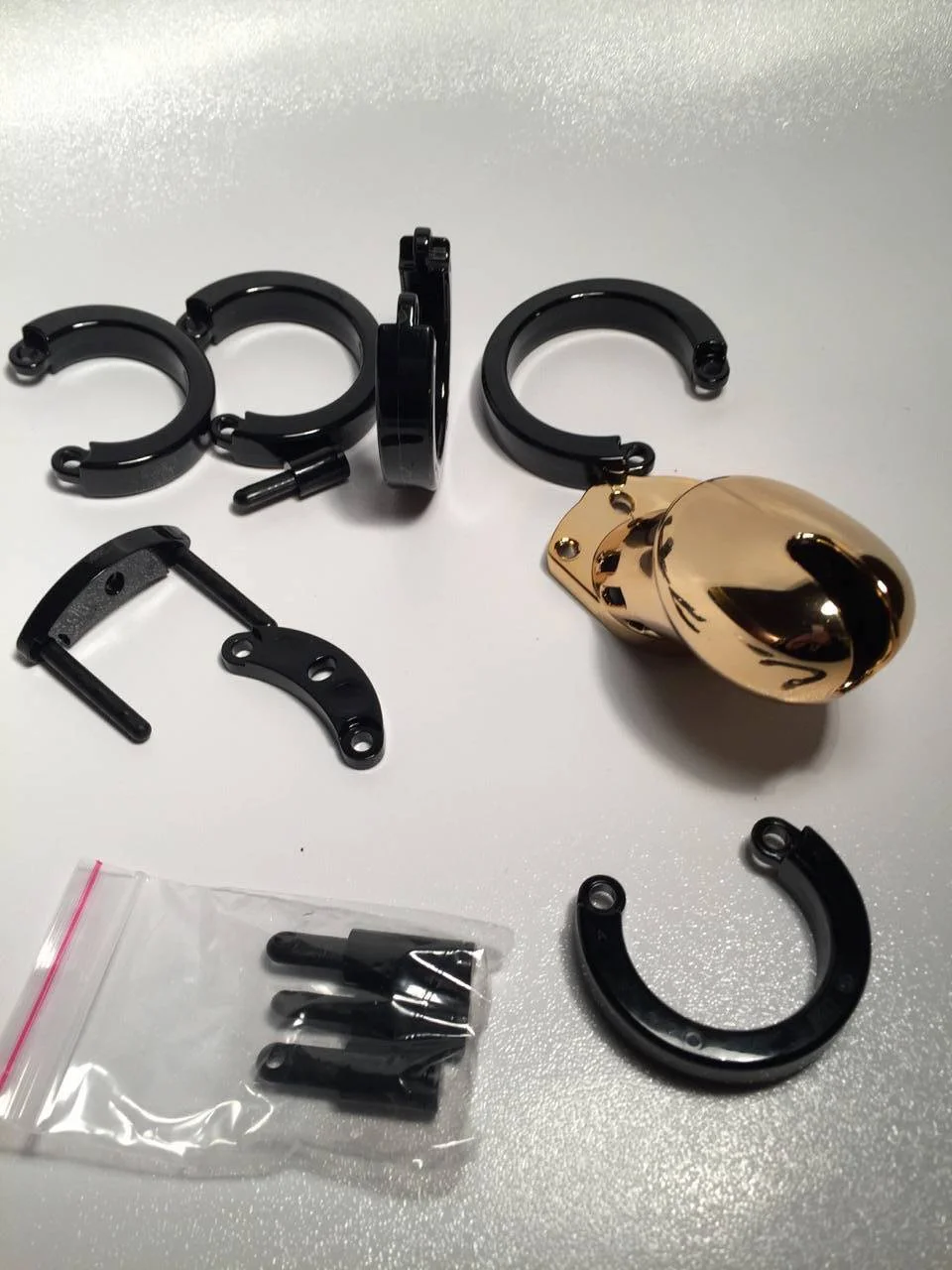 Il y a un petit cadenas en acier et 3 en plastique pour un usage unique (ils sont numérotés pour éviter que le soumis ne triche, tout est prévu !). Il est possible d’ajuster le diamètre de l’anneau qui passe sous les bourses (il y a quatre tailles) ainsi que la position de la gaine pour le sexe (plus ou moins proche de l’anneau).