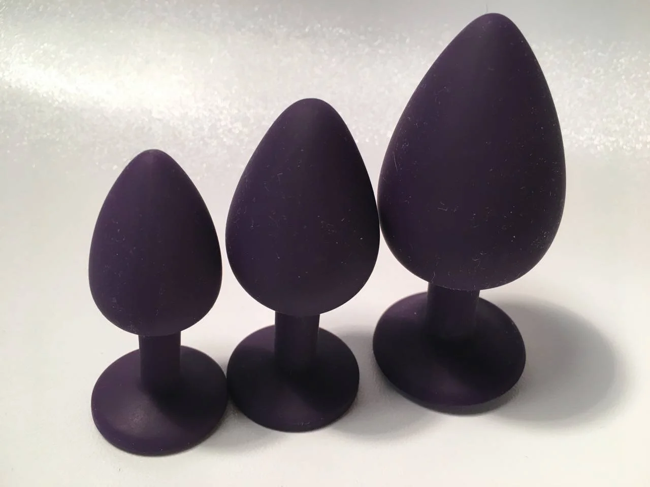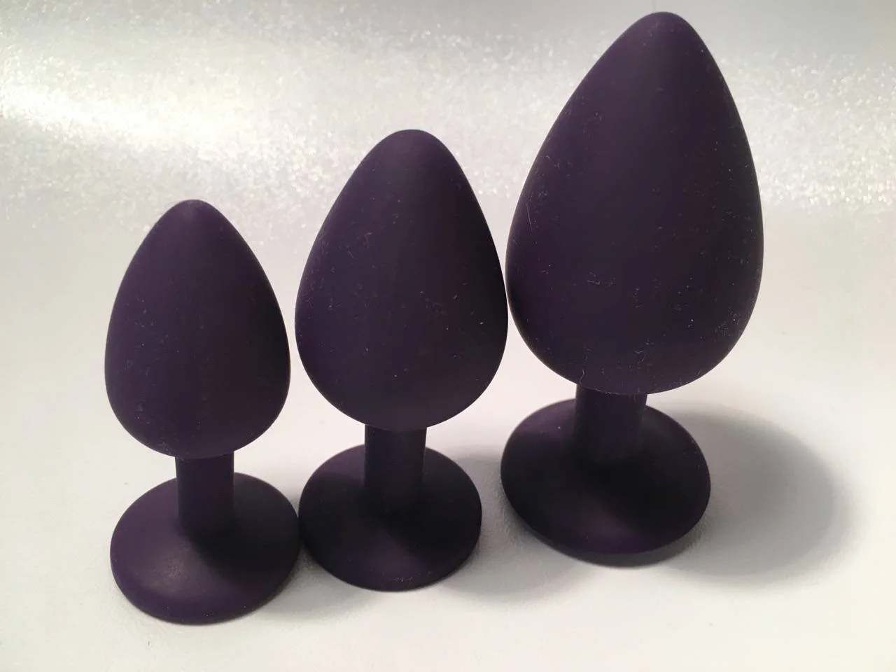 Les trois plugs sont en silicone et disposent d’un brillant collé dans la base. Ils font (du plus petit au plus gros) : 7,2 cm, 8,2 cm et 9,5 cm de long pour un diamètre respectif de 2,6 cm, 3,3 cm et 4 cm. Par ces dimensions, ils conviennent donc aux débutants mais aussi aux personnes expérimentées qui souhaitent porter du 4 cm.