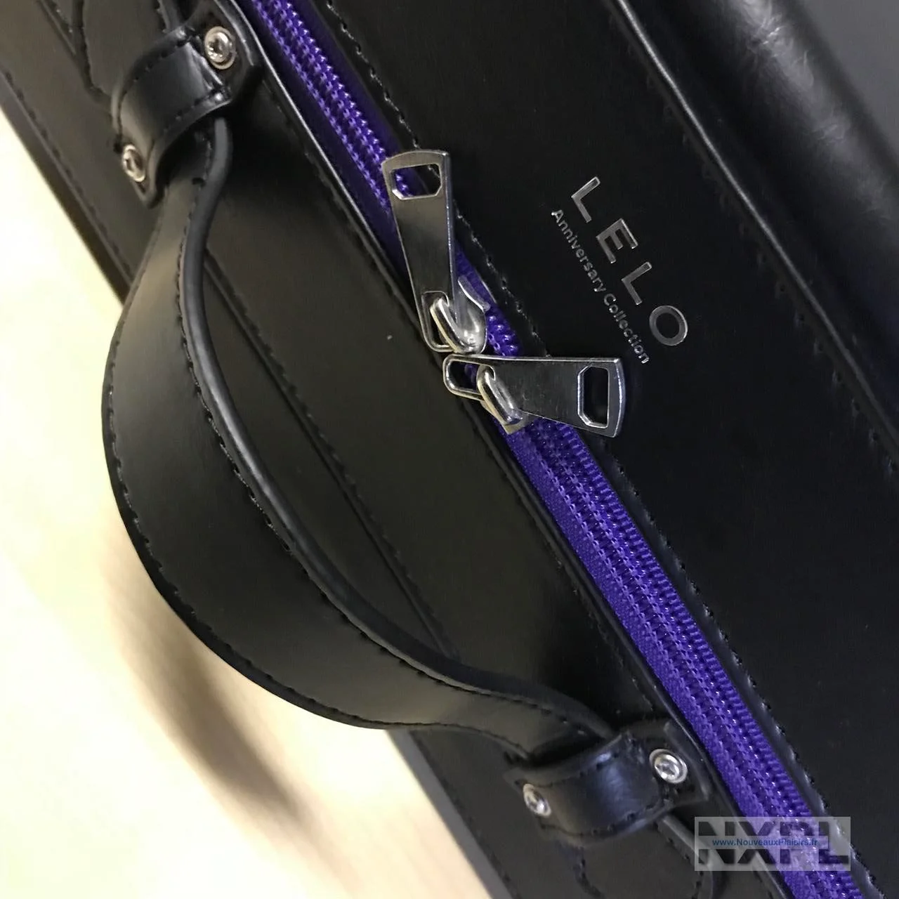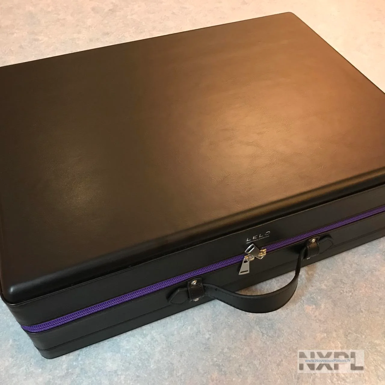 Je me suis fait moi-même cette remarque après avoir reçu ce gros paquet volumineux de la part de Lelo. J’ouvre le paquet, et je découvre une valise en cuir, noire, très sobre, dotée d’une fermeture éclair mauve et portant un discret logo “Lelo Anniversary Collection”.