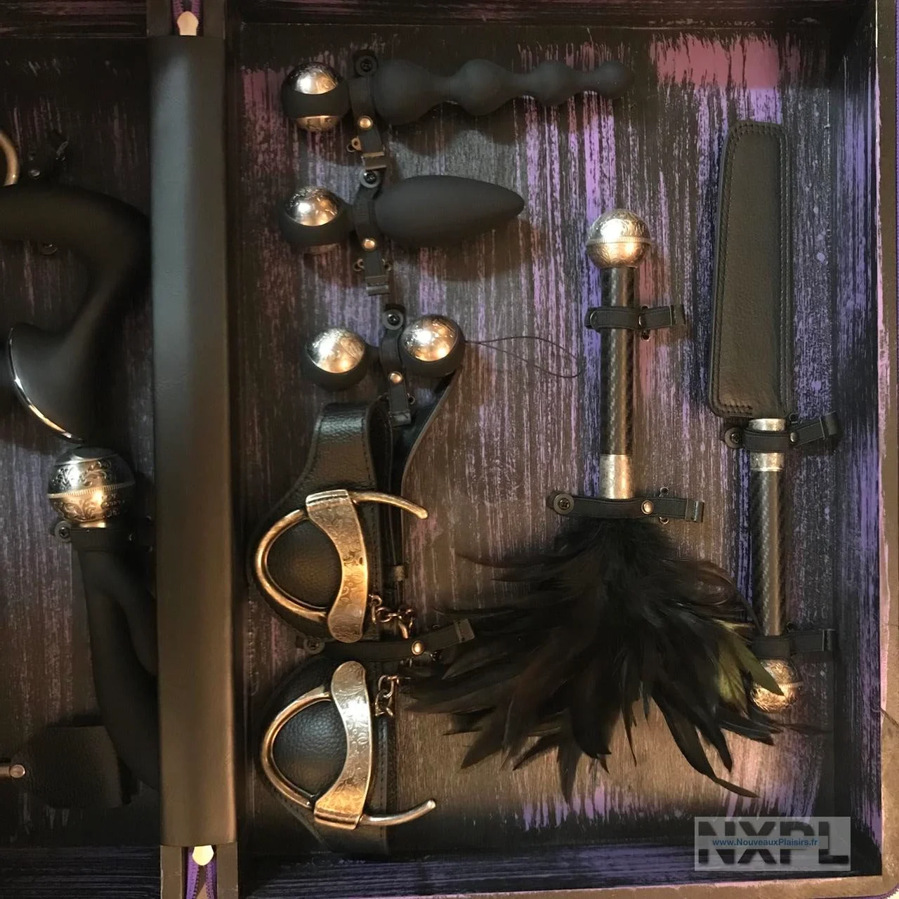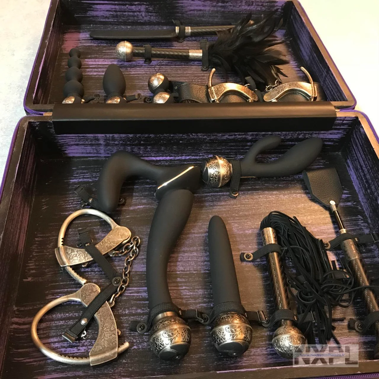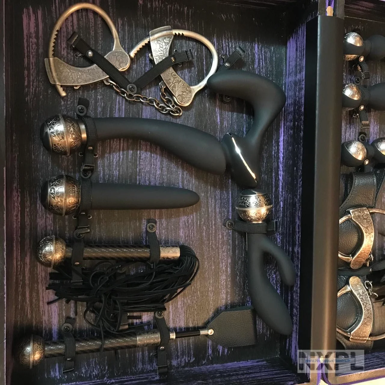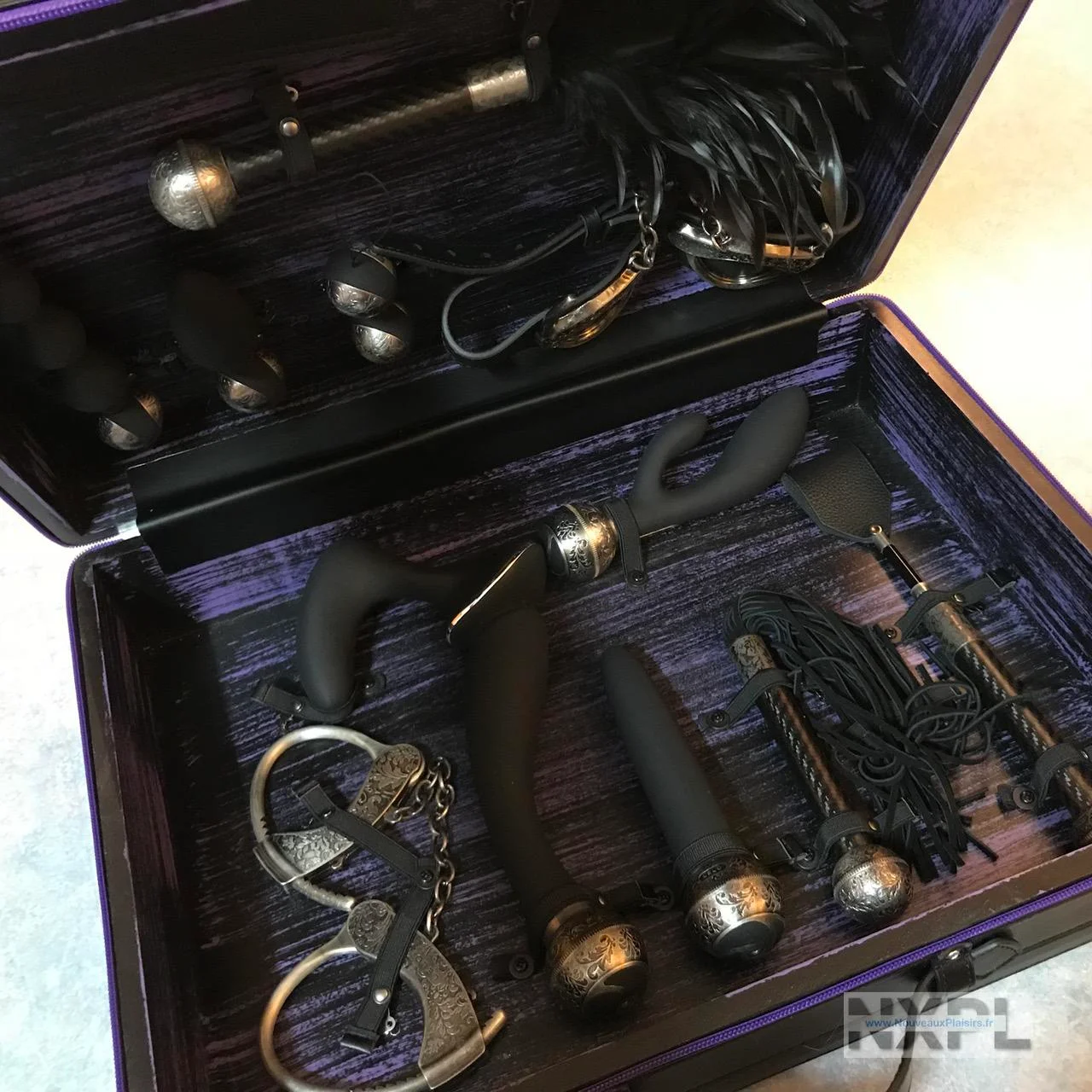 Le design est à tomber, dans des tons de noir et mauve pour la valise elle-même, les accessoires sont noirs et métal, avec un métal ultra travaillé, il y a du cuir et du carbone aussi. Je dois avouer que c’est le truc le plus classe que j’ai vu dans le monde des accessoires intimes et sextoys depuis mes 9 ans de sexploration intense.