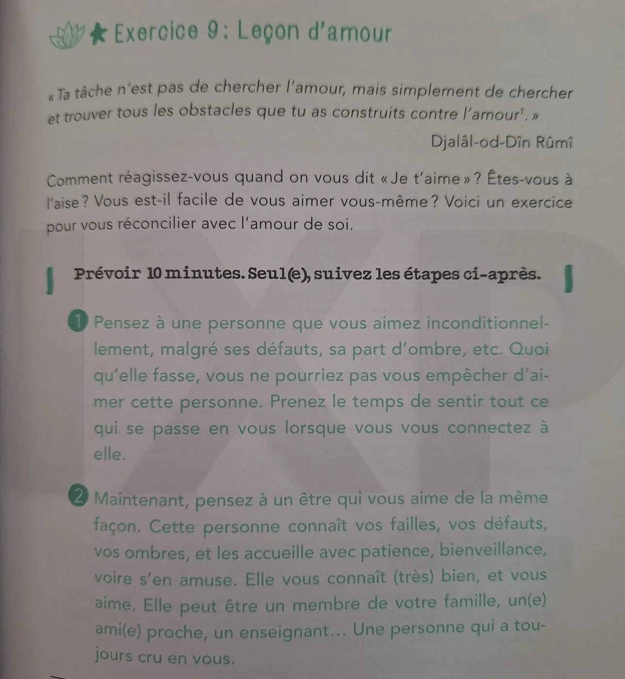 - Balayer devant mon cœur pour en ouvrir la porte : Des exercices qui aident à comprendre vos désirs profonds, vos peurs et vos pensées limitantes. Plus vous vous connaissez, plus vous pouvez avoir une discussion de qualité avec votre partenaire.