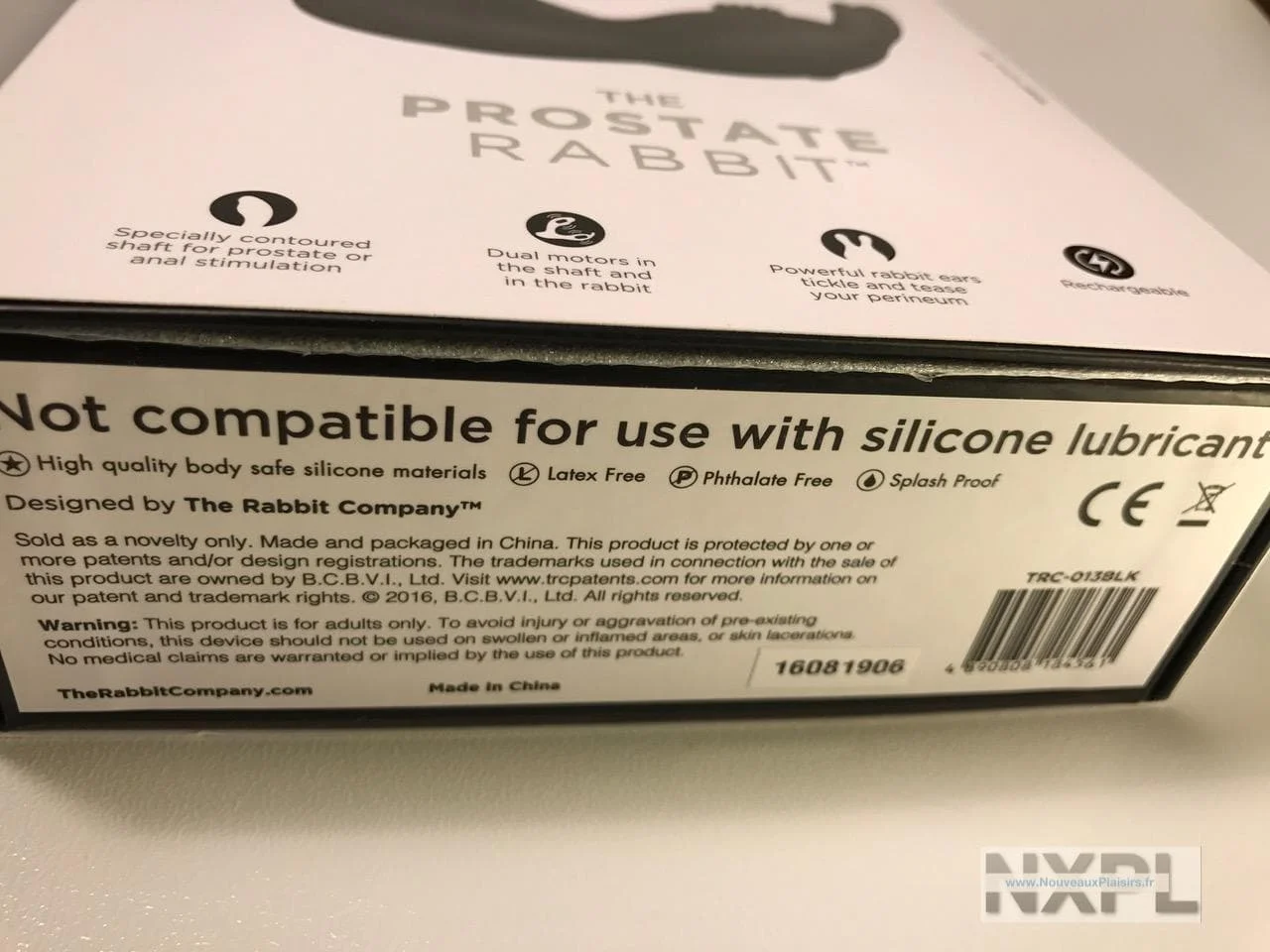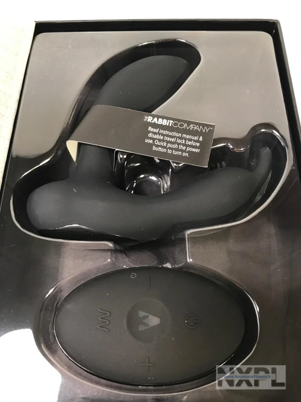 Le Prostate Rabbit est livré dans une grande boîte en carton, décorée de l’image du sextoy, de sa télécommande et listant les caractéristiques de base. C’est assez peu discret : il ne faudra pas la laisser traîner sur la table si mamie vient faire le ménage ou passer du temps avec les petits-enfants le week-end (ben quoi… j’ai des lecteurs de tous âges évidemment ;) ).