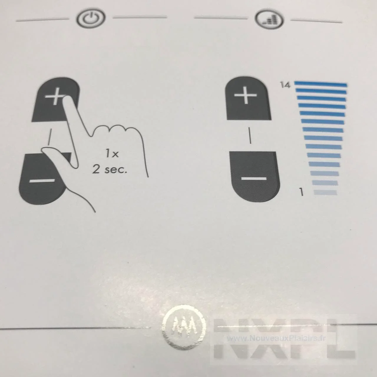 Coté programmes de vibrations, il y a 14 niveaux de vibrations différents. Tout cela se pilote par un bouton ”+” et un bouton ”-”. On allume en pressant quelques secondes le bouton ”+”, bref, rien d’exceptionnel, du très classique pour le contrôle.