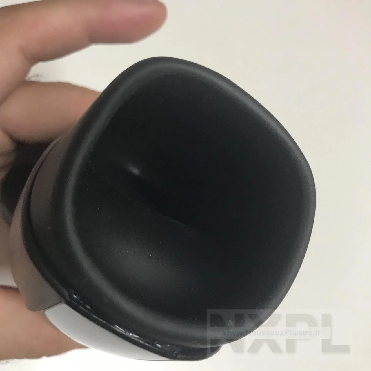 L’embout en silicone dans lequel on glisse le sexe est souple et donc s’adaptera à toutes les tailles de gland sans problème. Il doit faire environ 4,5 cm de diamètre (mais il est carré de forme) sur une profondeur de 7,5 cm au plus profond. On notera que l’orifice dispose d’une forme spécifique en biseau sur la profondeur qui permet de stimuler plus fort le gland à mesure que l’on pousse (car cela rétrécit le diamètre). Nous verrons l’efficacité ensemble dans le test.
