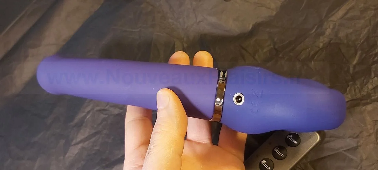 C’est un bel objet que nous avons là, très agréable au toucher, finition parfaite, il y a un insert métal à la base du dildo, je trouve ça classe ! Ça ne sert à rien mais ça fait luxueux. La télécommande est elle aussi très bien finie. Elle présente 5 boutons : ( + ) et ( - ) pour gérer la puissance des vibrations et un bouton par moteur pour les contrôler séparément.