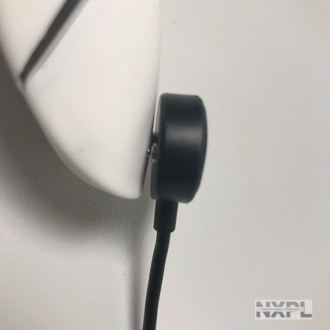Il se charge par un contact magnétique, donc pas de problème d’étanchéité et c’est hyper pratique. Il suffit d’avoir accès à une prise USB (d’un chargeur de téléphone par exemple).