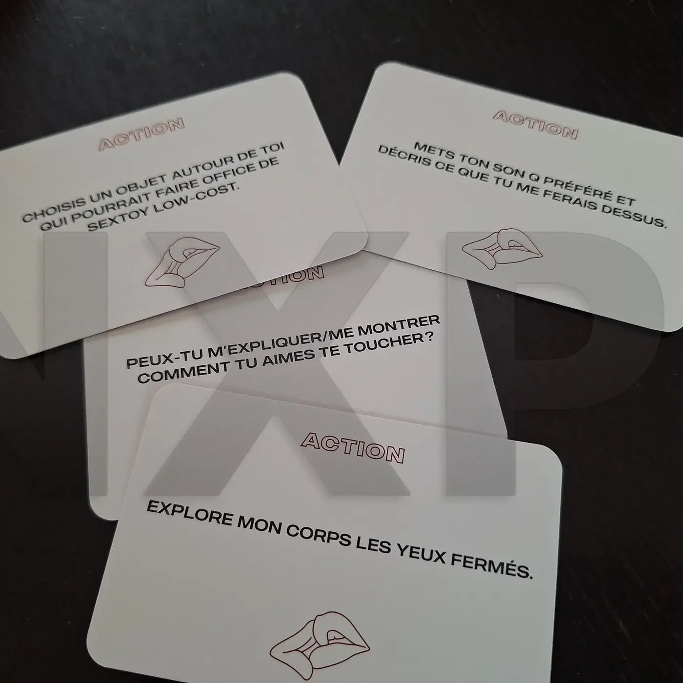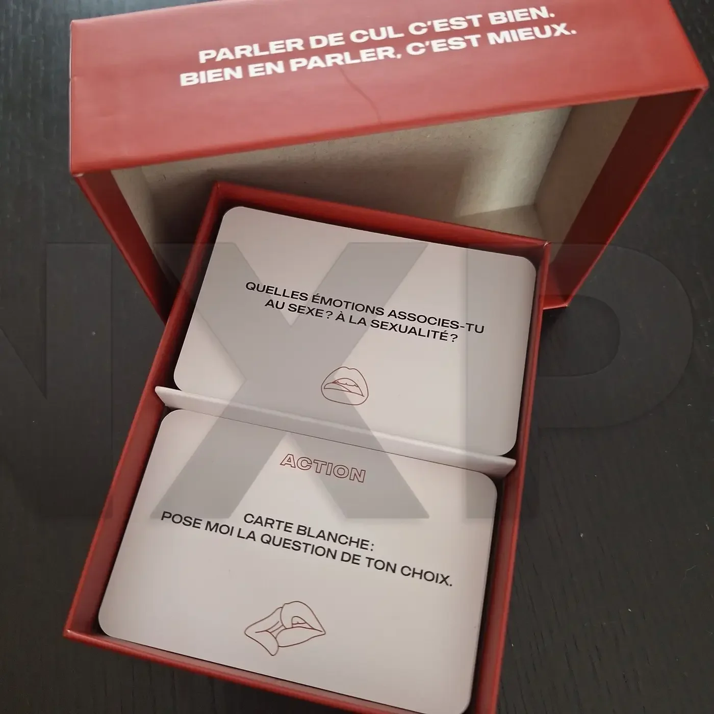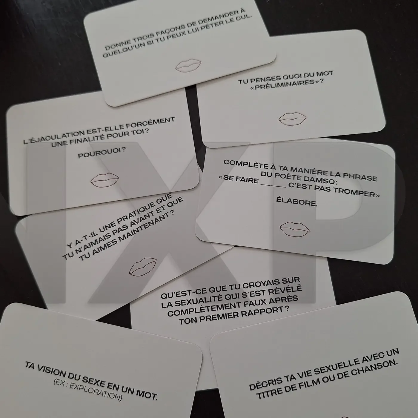 - Des cartes questions qui couvrent tout le spectre du sexe : premières fois, fantasmes, pratiques, ratés, envies, limites, sextoys, pornographie, etc.