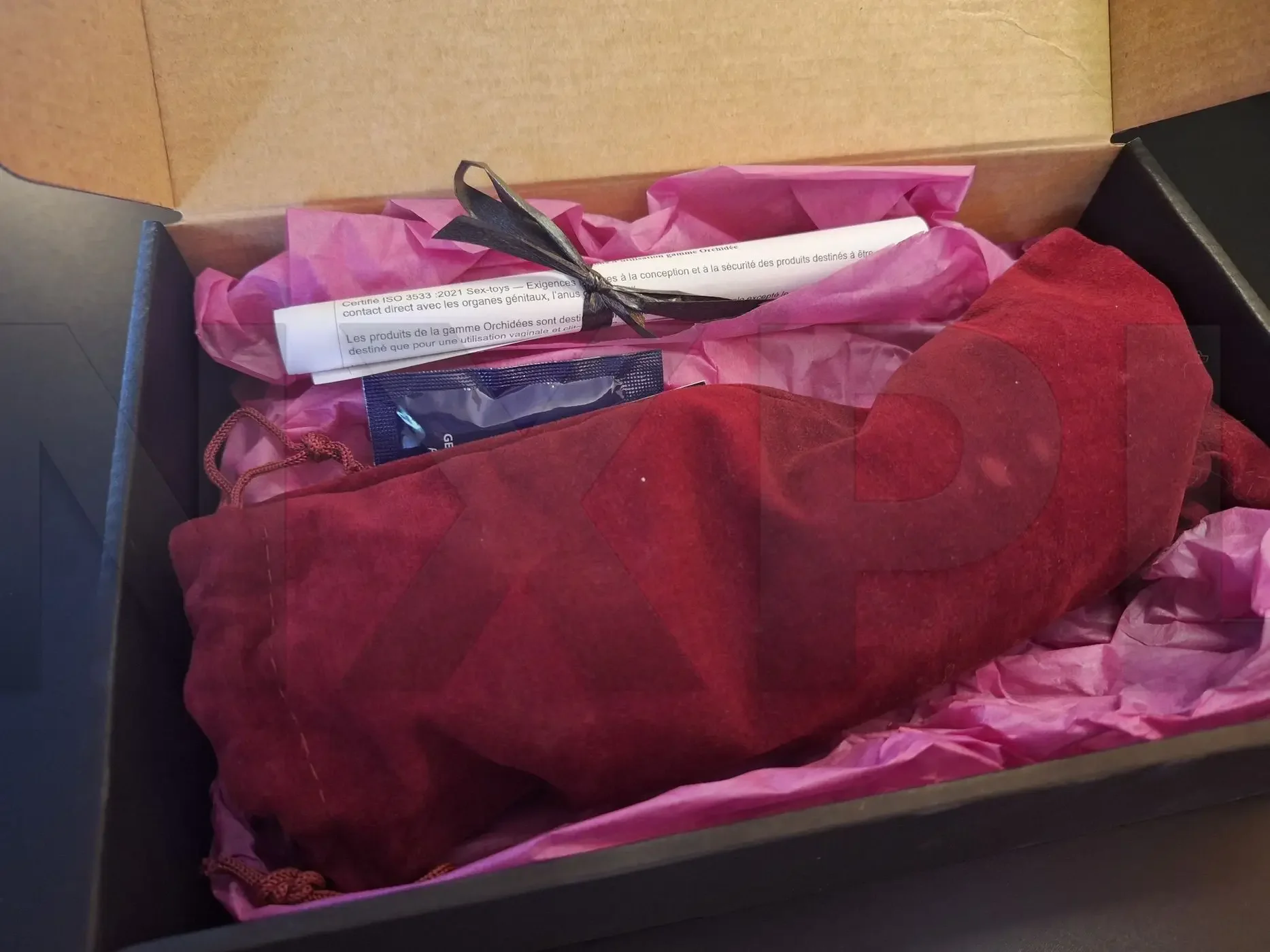 On retrouve dans la boite l’Orchidée N°5 Max dans une belle pochette en velours, un peu de lubrifiant, une carte de visite d’Idée du plaisir, une feuille roulée type parchemin qui contient les instructions d’utilisation et la sécurité de la conception.