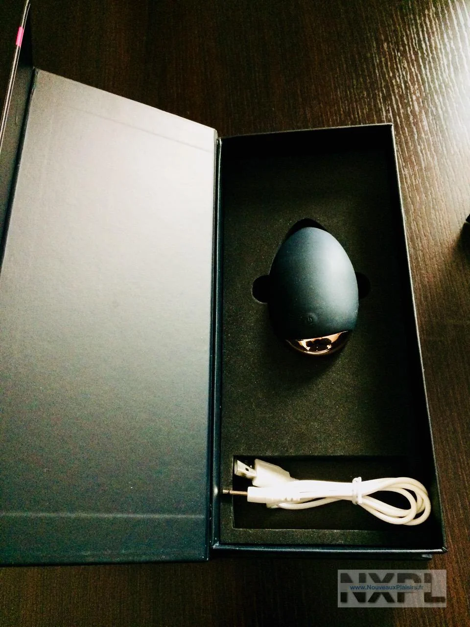 La boite est très grande pour ce petit sex-toy, noire et rose, élégante, le nom du jouet y étant calligraphié en argenté. A l’intérieur, on trouve le galet, bien rangé dans sa gangue en mousse expansée, un câble USB pour le charger (mais pas d’adaptateur) et un mode d’emploi des plus succincts (et quand on est une quiche comme moi, ça peut-être trop succinct!)