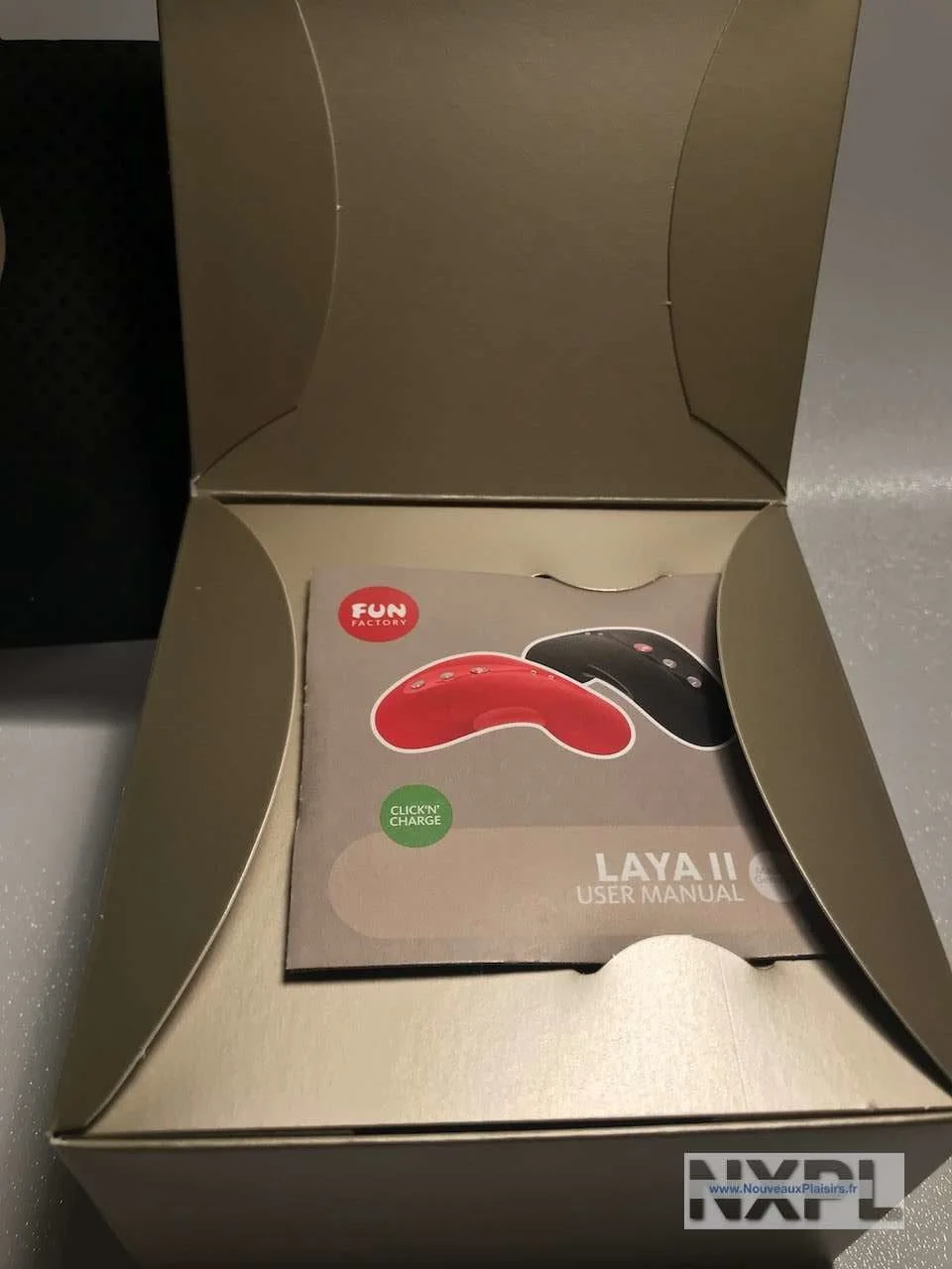 Il est emballé dans une petite boite en carton, décorée de l’image du Laya 2 dans le pur esprit Fun Factory. C’est à la fois assez discret mais bon, on ne pourra quand même pas la laisser trainer sur la table à manger le dimanche…