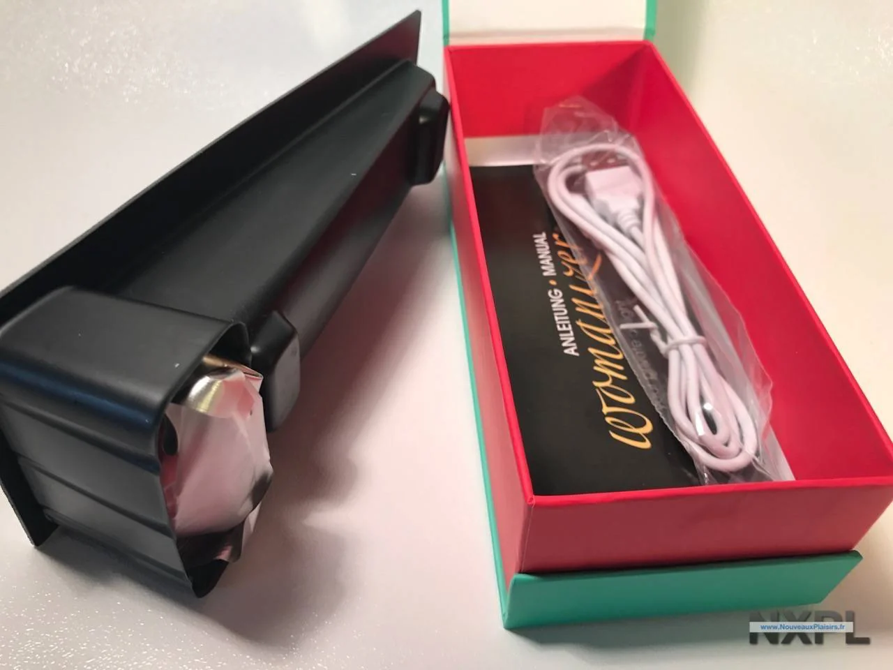 La boite contient donc, le Womanizer et, quand on soulève le socle sur lequel est posé le womanizer, on trouve un guide d’utilisation, le câble de chargement et un embout de taille XL (plus gros que celui monté en standard).